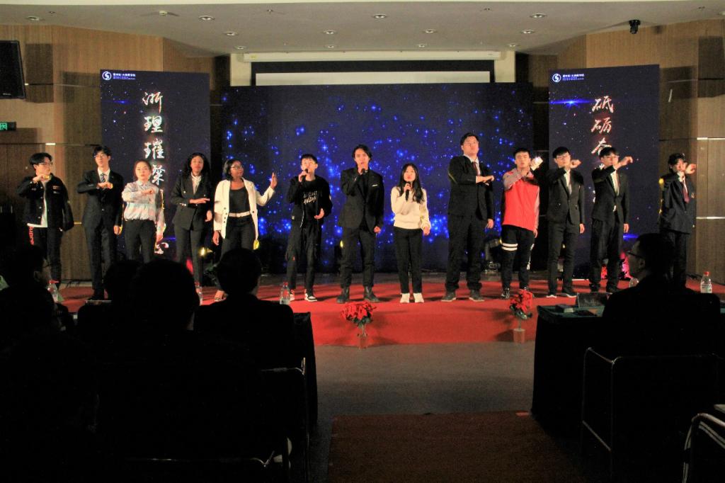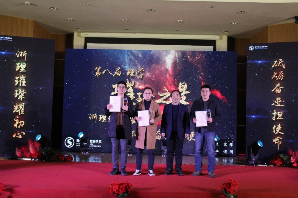 共有10名学生获得本届理学·璀璨之星,葛龙威老师,俞建平老师以及章迪平老师璀璨之星们颁发了奖杯与证书,并一同合影留念。