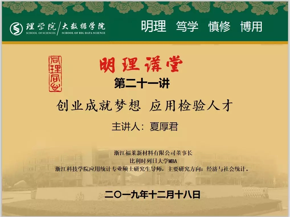 本期明理讲堂主讲人夏厚君董事长在讲座开始时就以幽默风趣的口吻描述着他是如何白手起家到成就如今这番事业的,以朋友的身份与我们分享他创业过程中的所思所想,这不仅拉近了我们的距离,让大家感受到了何为大将风范,也为这场讲座奠定了轻松欢快的基调。