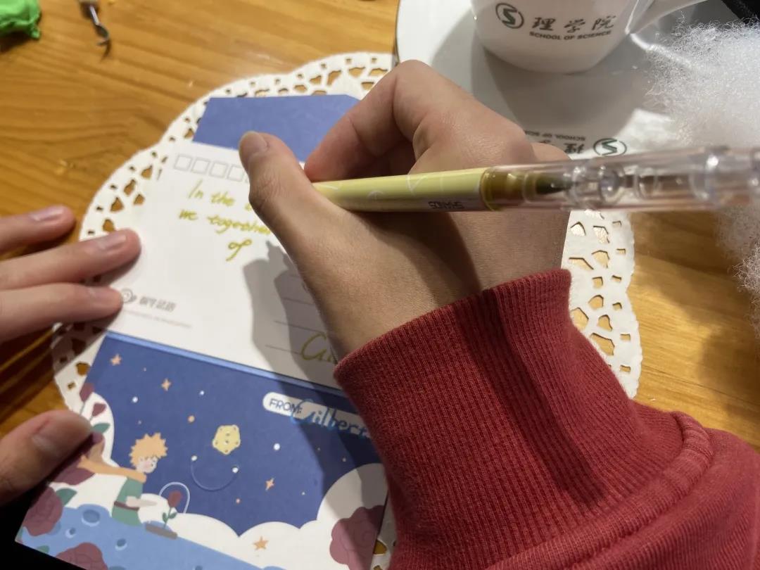 粘土做完之后,陆文婷带领大家在明信片上记录此刻的心情和祝福,并将祝福的贺卡随机分发给在座的同学。希望大家可以一起分享自己的心情,互相倾听,互相了解,有个人给自己认真的写了贺卡,也会很开心的吧。