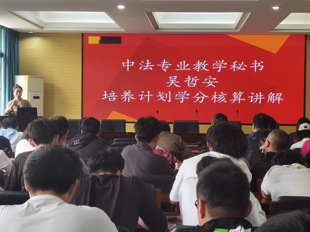 蔡瑞康进行了学风建设与管理相关内容的介绍,结合学生手册和工作案例,对同学们建设优良学风进行了动员,并介绍接下来学院学院帮扶政策和政策。花彩霞对学业毕业环节从了解现状、解决问题、能做什么、要如何做,四个方面做出了介绍。并且针对不同年段出了不同的方案解决现阶段的困扰。吴哲安针对中法专业的特殊性,从培养计划如何进行学分核算进行了讲解。