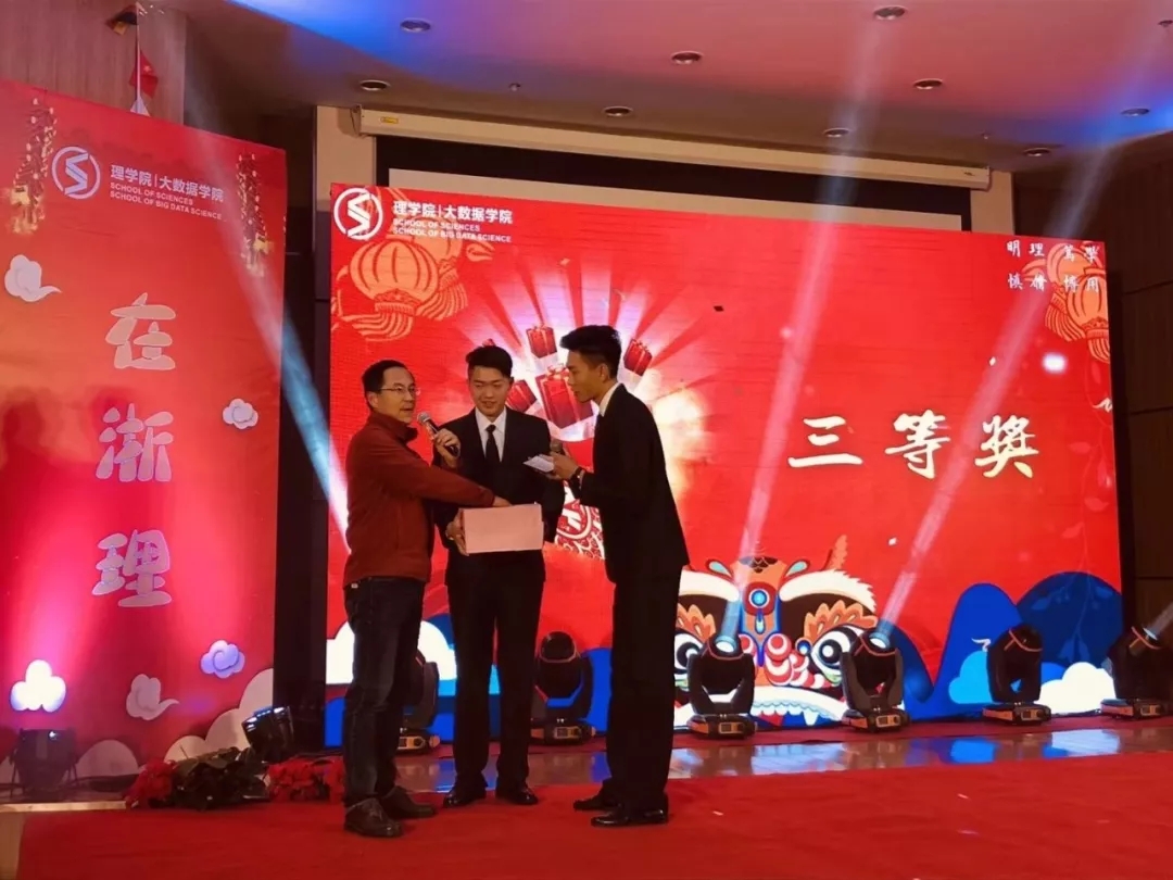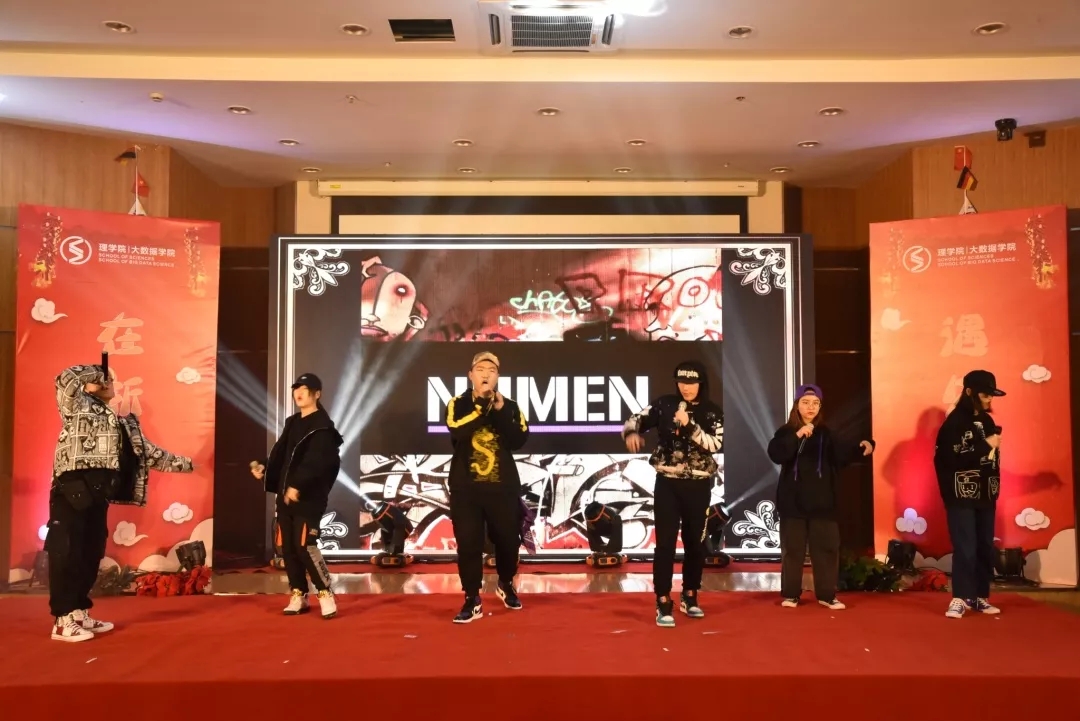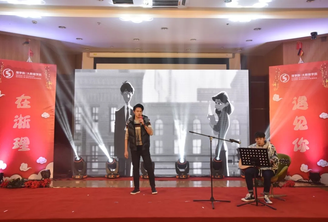 老师项楠、王宝明、吴鹤群、杨娇、石大力(从左往右)组成的“理学天团“凭一曲《知足》首次亮相,带动了台下同学齐唱,将晚会气氛推向了高潮。