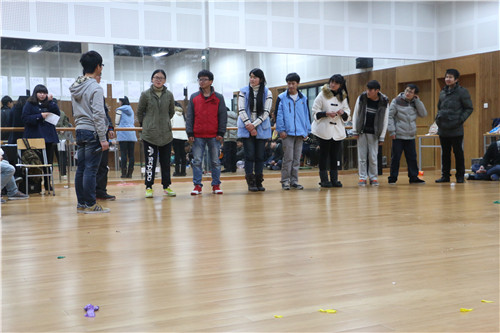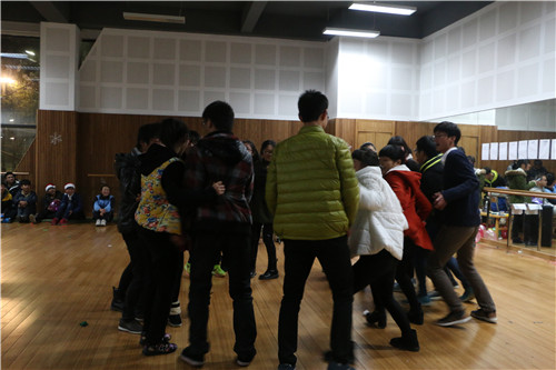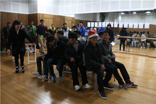 清脆、甜美的歌声,拉开晚会的序幕。圣诞节日的气氛,在同学们间迅速漫开,经过简单的分组,同学们迅速进入到第一个游戏“抢椅子”,围着椅子,同学们展开了激烈的角逐。如果说抢椅子同学们灵活的身姿的体现,那么“五毛一块”则是智慧的比拼。每组分别派出一位男、女同学,男女同学用智慧展开对决,比赛关键时刻,出现“二女争一男”,真是险象环生、惊心动魄。