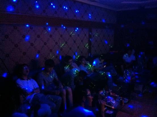 灯光流转的包厢内,洋溢着热情,充斥着欢笑,一首首动听的歌曲:激动人心的《最炫民族风》,劲爆的《浮夸》,柔情似水的《新贵妃醉酒》,平静温婉的《后来》、《勇气》,欢快甜蜜的《爱丫爱丫》,深沉浓郁的《富士山下》等。社长,部长和我们一群干事拿着麦高歌,掌声,欢呼声此起彼伏,爆米花的香味更添了一抹温暖的感觉,大家都以最高的热情沉醉其中,当国歌声悠扬地奏响,全场一阵热情澎湃,高喊着,“打到日本鬼子,钓鱼岛是中国的”。最后,我们以《我的好兄弟》愉快地结束了这次令人难忘的聚会。