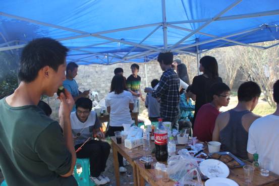 在车上,伴随着同学们的笑声,终于到达了烧烤的地方—“金之满农庄”。走进农庄,在太阳的照耀下显得无比欢乐,找到我们烧烤的位置后,大家齐心协力地整理好食物,生好火,准备我们丰富的午餐,烧烤的过程中,其乐融融也。