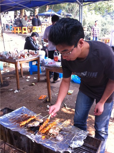 11月13日, 信计091班经过筹备到九溪举行了一场烧烤活动。早上9:00,同学们提着准备丰富的烧烤食物,怀着轻松愉悦的心情向着目的地九溪出发,所有同学到达后,便分散围炉而坐。很快炉子里的黑炭燃起来了,炉子边围坐着每位同学脸被映得很红。同学们都积极参与铺砖生火等准备工作,自得其乐。在一片欢声笑语中体验着集体烧烤的乐趣。烧烤结束后,我班同学进行了集体游园,拍照留念以及玩各种牌类游戏等活动。整个场面十分热闹,洋溢着一种欢快的气氛。时间飞快的流逝,美好的时光总是短暂的,烧烤活动慢慢的接近了尾声。通过本次秋游活动,同学们不仅增进了彼此之间的友谊,培养了默契,同时也加强了集体荣誉感。