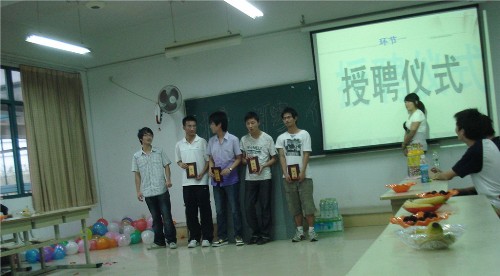 社管中心前任主任,现在已经大四的孙晓蕾学姐为四个社团的2010-2011学年的会长颁发聘书。孙晓蕾学姐不仅发表了一些自己对过去工作的感想,也将一些励志的话语赠予了作为后辈的现任会长们。紧接着,各位会长也都为各自社团的部长们颁发了聘书。在接受聘书的同时,各位会长及各位部长都对自己过去两年的工作,做了一些总结,也与大一的同学分享了一些自己工作上的经验与工作中的喜怒哀乐。