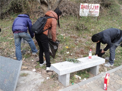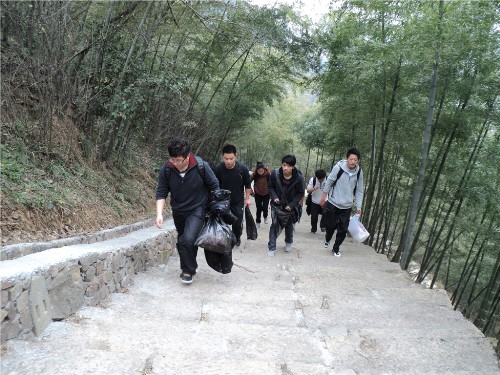 虽然没有小旗子在前面带队,但我们一样充满精神,分工明确;虽然我们没有专业的登山装备,但我们一样努力给大山除去污点;虽然我们没有大队的人马,没有响亮的口号,但我们踏踏实实的做事。路上的行人用赞扬的目光看着我们,亲切的问我们是什么学校的学生,真诚的说我们做得好。
