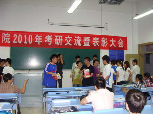 考上研究生的同学代表分别从多个侧面,多个角度,全方位地与大家分享了他们的考研经历、复试经验等,并且把自己珍贵的复习资料赠送给了下届准备考研的学弟学妹。07、08级准备考研的同学代表也纷纷表达了考研的决心,与会同学还进行了现场交流。