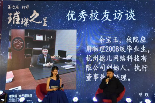 吃瓜黑料网 应用物理2008级校友,杭州德儿网络科技有限公司创始人、执行董事兼总经理余宝玉获杰出校友璀璨之星。他在访谈中回顾了自己的大学生活,叙述了个人创业经历,并建议大家要在大学期间广交朋友、学好专业知识。