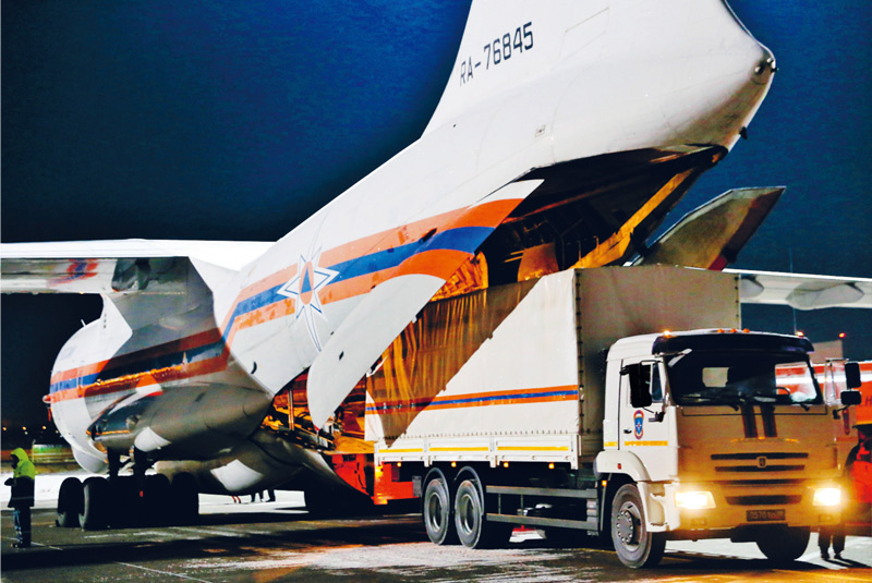 2020年2月8日,在俄罗斯莫斯科附近的茹科夫斯基机场,工作人员将俄罗斯政府向中方提供的医疗援助物资装上运输机。