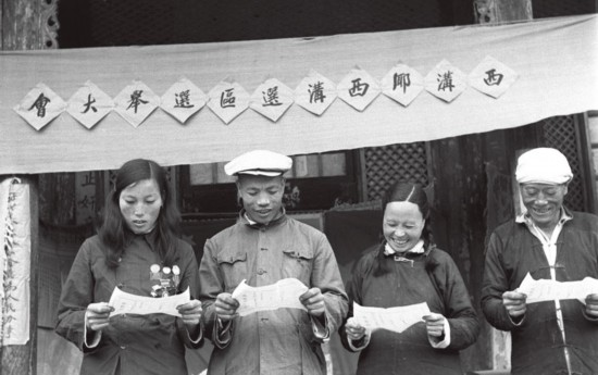 山西省平顺县西沟乡西沟区在1953年9月27日举行选举大会。全国著名农业劳动模范李顺达、申纪兰被选为西沟乡人民代表大会的代表。图为在西沟区选举大会上被选为代表的(自左起)申纪兰、李顺达、韩春兰和张秋全在观看当选证书的情形。 新华社记者 项化庚/摄