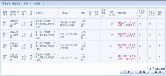 3)如果弹出该课程的开课信息,则在“选择情况”栏选择要跟的班级,并选择是否预订教材,再点击“选定”按扭,即可成功报名: