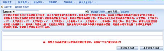2)如果弹出“该课程不再开设,请选择该课程的替换课程进行重修”的提示信息,则在下拉列表框中选择该课程的替换课程。课程替换对照信息,可到本学院公告栏查询或向本学院咨询;