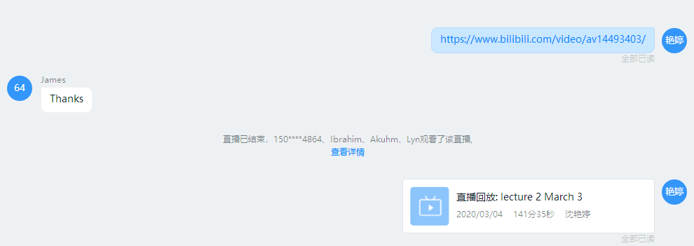 总体而言,第一周的线上教学还是比较顺利的,学生反馈也较好,对于在线平台的使用也比较好,能够积极参与到课堂讨论中来。但是,直播过程中,尤其是与2-3位学生同时连麦过程中,出现了几次网络较卡的情况。接下来的课堂互动,将尽量减少与多位同学同时连麦,选取代表性的学生分开进行可能效果会更好。