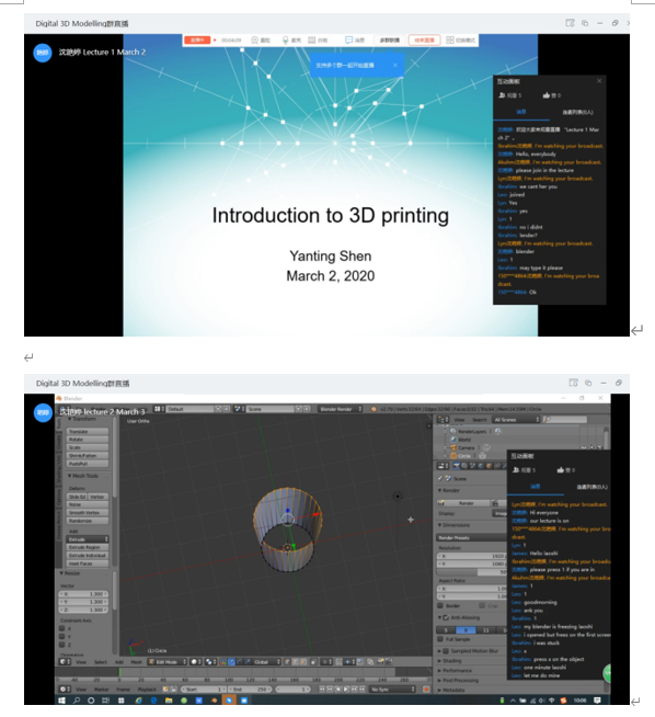 最终,在开学前一周,我与班级同学进行课前演练,让学生也提前熟悉平台使用细节,同时让18级学生提前下载课程所需的免费3D建模软件Blender,尽量减少后续教学过程中因为下载软件等原因造成的网络问题。也与身在芬兰的19级留学生Nette协商因为时差引起的教学安排的问题。