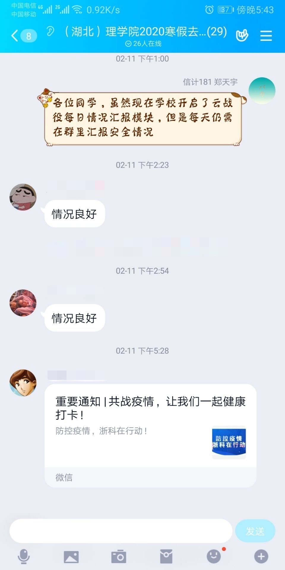 身为浙科院的一名入党积极分子,同时作为一名身处疫区的湖北人,我对着突如其来的一切都感到始料未及。但在看到国家迅速采取行动,积极应对时,我也意识到我身上肩负的责任。由于行程原因,在湖北封锁前,我回到了老家(仍在湖北)。防疫抗疫工作开始,我们全家自行封户,主动隔离,每天实时关注疫情消息。同时积极配合学校疫情排摸工作,每日按时打卡,如实及时汇报个人健康状况。