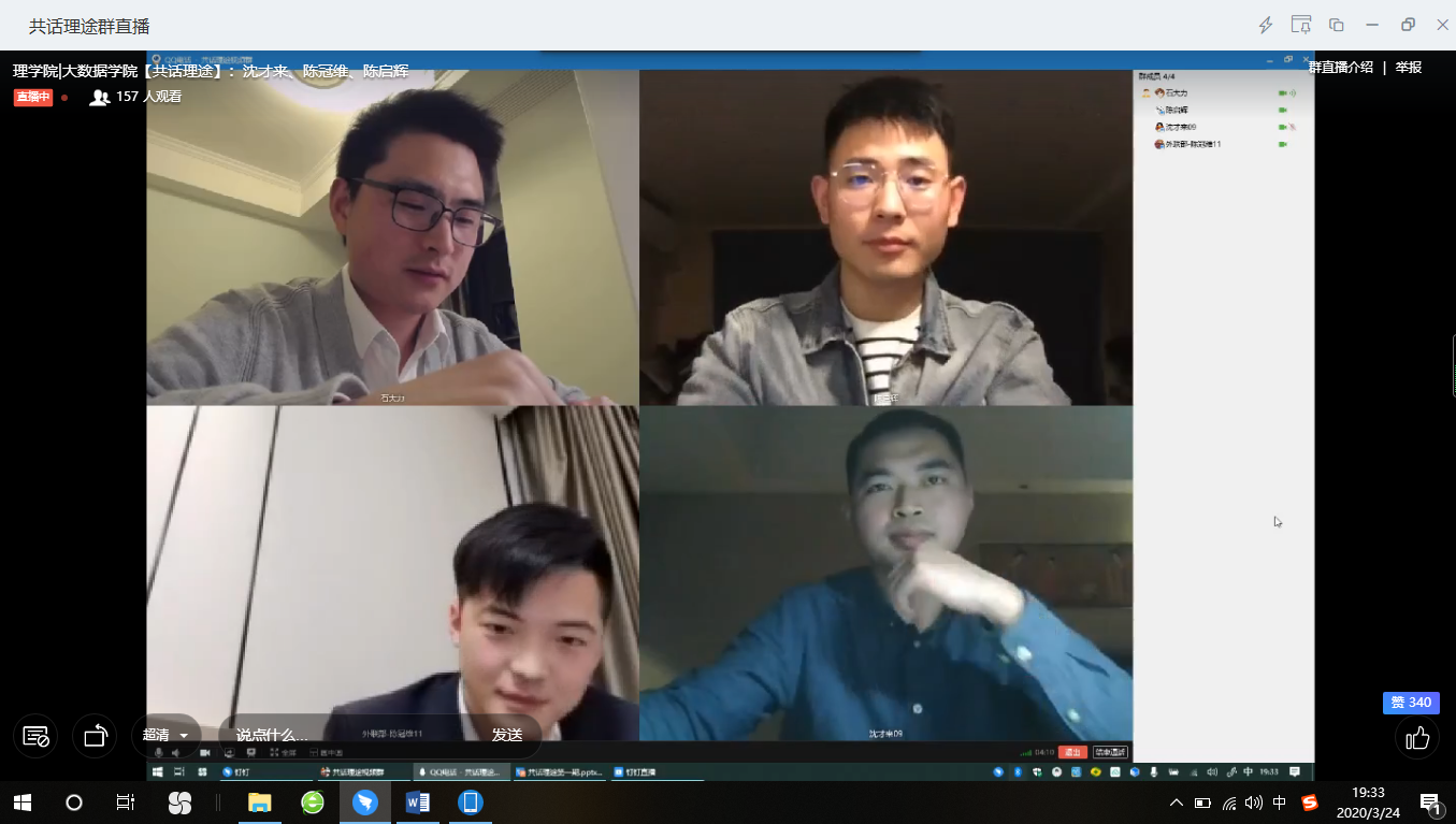 |曙光大数据学院组建“共话理途”平台开展校友分享会,旨在分享理学专业的职业前途、理学学子的职业前途,相关行业的发展前途。3月24日晚,共话理途第一期嘉宾09级沈才来、11级陈冠维、13级陈启辉三位校友应邀出席,通过钉钉直播与学院在校生共享经验,助力理学学子共同成长,会议由院学工办主任石大力主持。