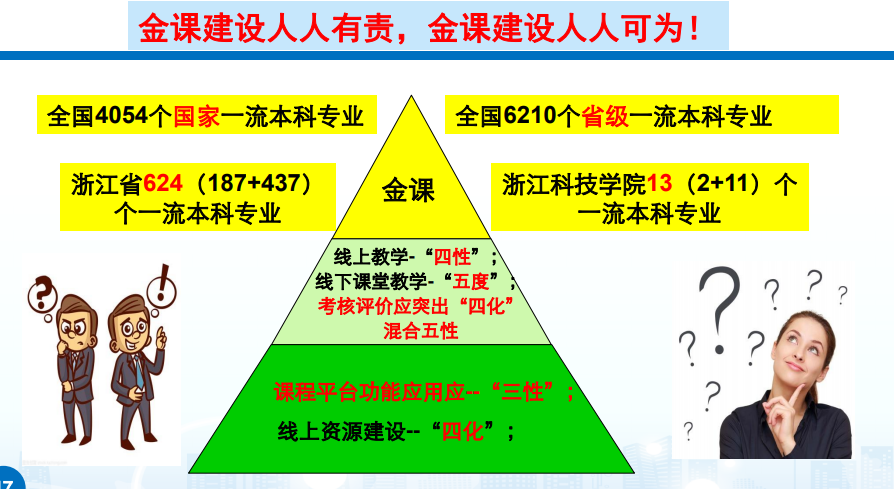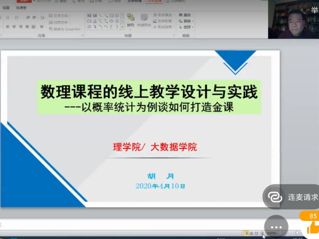 本次报告胡月老师从“金课背景简述”引申到“什么是五大金课”、“2019从课程到课堂的革命”、“2020年高校开展课堂教学改革的重点”;以所授课程“概率论与数理统计”为例,分享了课程的建设发展历程、课程内容与资源建设及应用情况、课程教学内容及组织实施情况、课程评价及改革成效等情况。最后,胡月结合疫情期间的教学安排,和老师们探讨了数理课程线上教学的实践与反思,传达了“金课建设人人有责,金课建设人人可为”的思想理念!