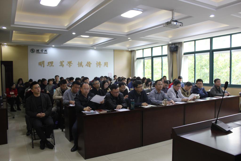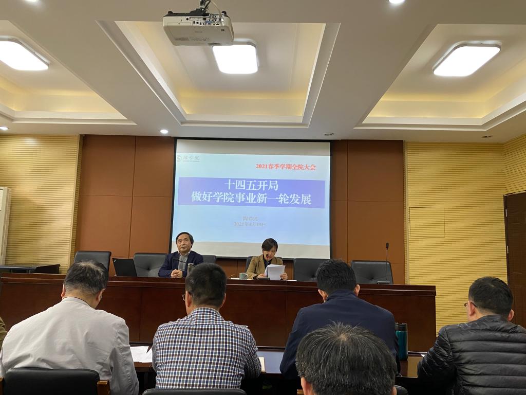 4月15日下午, 我院在A4-216会议室召开全院教职工大会暨教职工政治理论学习大会,传达学习习近平总书记重要讲话和学校相关会议精神。学院班子成员及全体教职工参加此次会议。会议由校党委委员/院长陶祥兴主持。