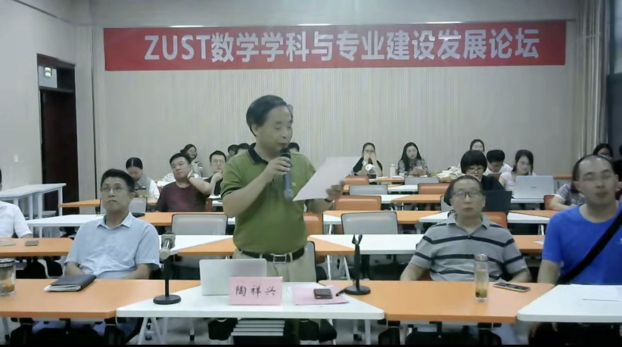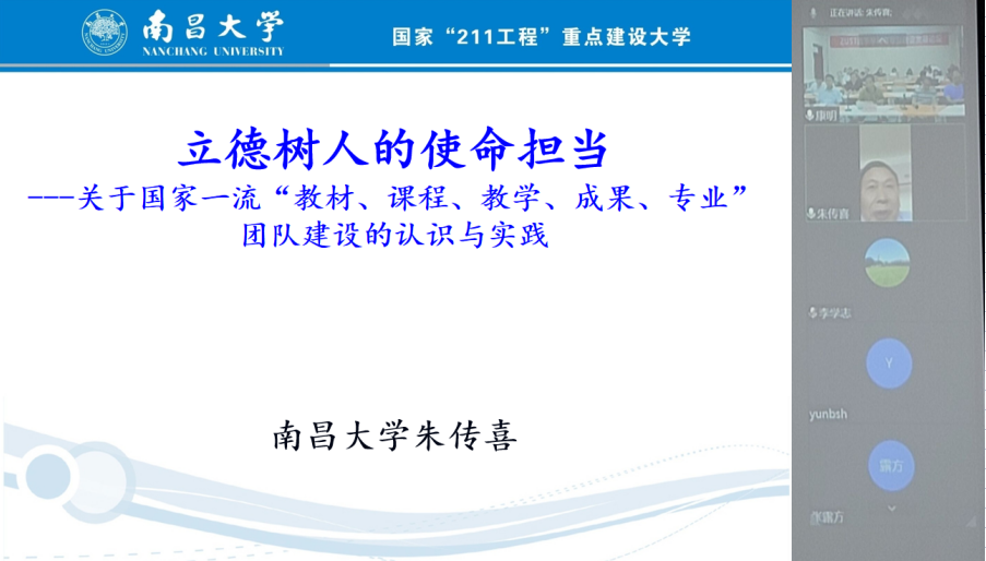 在闻理园A4-116召开“数学学科与专业建设研讨会”,在下午会议的专题报告环节,国家级教学名师、国家一流专业负责人、国家级教学成果获得者、南昌大学朱传喜教授应邀做了“立德树人的使命担当---关于国家一流‘教材、课程、教学、成果、专业’团队建设的认识与实践”的线上专题教学论坛。报告由校党委委员、学院院长陶祥兴教授主持。
