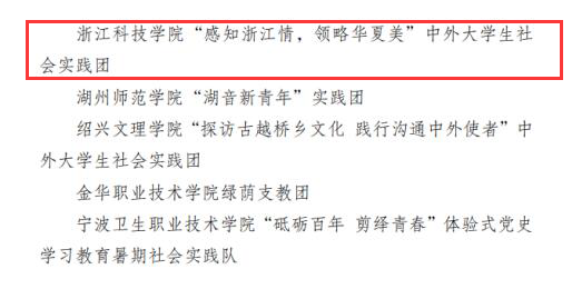 经基层申报、省级团委审核推荐、组织评议等环节,浙江科技学院“感知浙江情,领略华夏美”中外大学生社会实践团荣获团中央“三下乡”社会实践优秀实践团队。