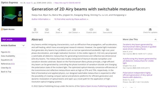 徐弼军教授指导的应用物理系2020级研究生薛晓菊同学以第一作者身份在美国光学学会旗下(OSA)著名学术期刊《Optics Express》(影响因子3.894,JCR一区,中科院二区)上发表了题为“Generation of 2D Airy beams with switchable metasurfaces”的研究论文,浙江科技学院为第一署名单位,应用物理系徐弼军和汪小刚分别为论文通讯作者和共同指导教师。