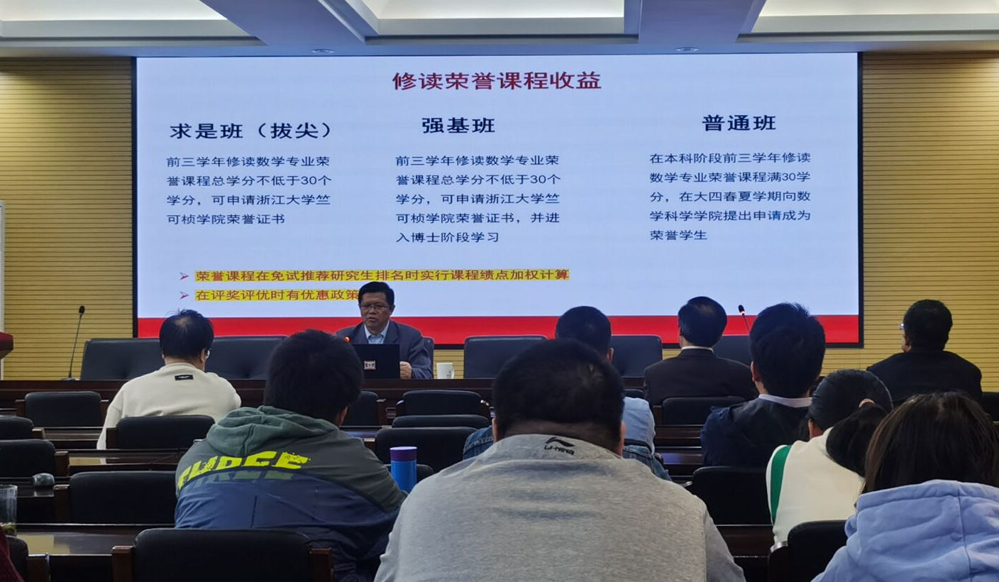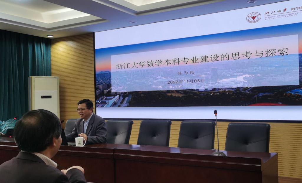 首先盛为民教授从浙江大学数学科学院的学科现状以及专业建设方向出发,介绍了浙江大学对标国际一流大学的课程体系、培养模式和培养质量的人才培养特色:多学科交叉培养、国际化培养、校内外合作培养等。然后盛教授分又享浙江省2021年度教学成果奖一等奖项目:“数学拔尖创新人才“二制三化”培养模式的近三十年探索与实践”在实际教学过程中的建设历程。(教务办:杜卫华)