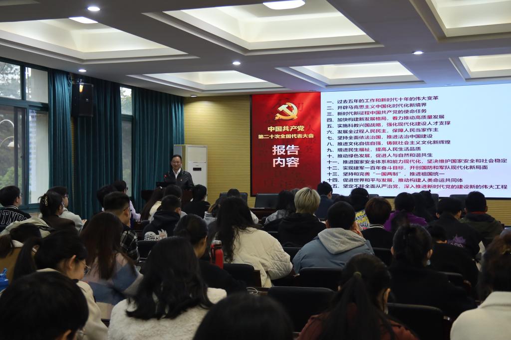第23期党校上第一课。学院党政班子成员、全体师生党支部委员、团委学生会骨干和第23期党校学员出席,宣讲会由学院党委书记张掬婴主持。