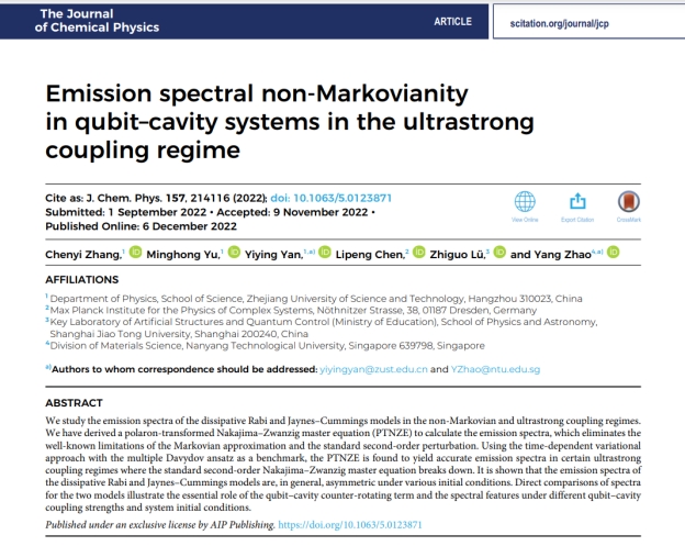 应用物理系2019级本科生章陈一同学(第一作者)和俞明宏同学(第二作者)合作在美国物理联合会(American Institute of Physics,AIP)旗下著名学术期刊《The Journal of Chemical Physics》(影响因子4.304,中科院二区Top)上发表了题为“Emission spectral non-Markovianity in qubit–cavity systems in the ultrastrong coupling regime”的学术论文。该论文利用极化子变换主方程及含时变分原理研究了在光与物质的超强耦合区的微腔量子系统的辐射谱特征。该论文中发展的方法不仅适用于量子光学中的腔量子电动力学(cQED)体系,也可应用于微腔化学体系。浙江科技学院为第一署名单位,应用物理系颜益营老师为该论文的指导教师兼通讯作者。(应用物理系:孙婷婷)
