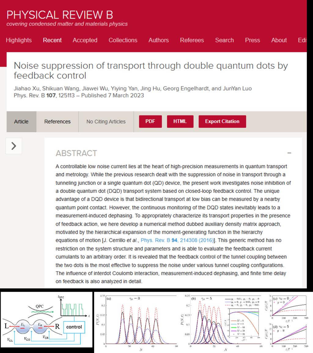 应用物理系量子信息物理研究团队中2020级研究生许佳昊同学以第一作者在国际权威物理学术期刊《Physical Review B》上发表了题为“Noise suppression of transport through double quantum dots by feedback control”的研究论文,浙江科技学院为论文第一完成单位,物理系骆钧炎和颜益营为论文通讯作者和共同指导教师。《Physical Review B》是由美国物理学会(American Physical Society)主办的学术期刊之一,影响因子3.908,中科院二区TOP期刊,是凝聚态物理方面最有影响力和最权威的期刊之一,也是自然指数(Nature Index)收录的全球82个顶级期刊之一。