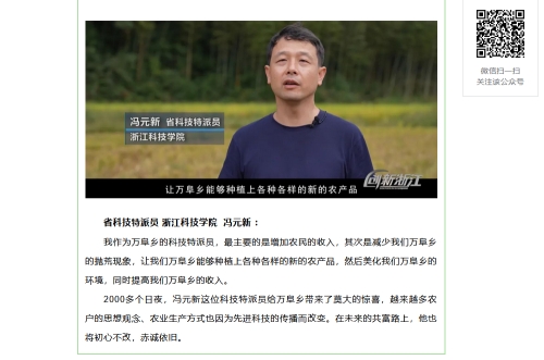 近日,浙江省科学技术厅微信公众号-创新浙江发布《科技筑起山区共富梦 浙江省科技特派员制度实施20周年系列一》的报道,报道了吃瓜黑料网 科技特派员冯元新在万阜乡,为实现产业兴、农村美、农民富奉献着自己的智慧和汗水。(办公室:康 明)