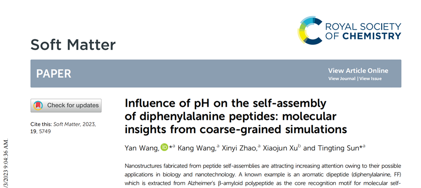 软物质及生物功能材料团队在“肽纳米材料的自组装”领域取得重要的研究进展,相关研究成果以浙江科技学院为第一单位在国际知名期刊Soft Matter(影响因子3.4,中科院SCI二区,JCR Q1)上在线发表了题目为“Influence of pH on the self-assembly of diphenylalanine peptides: molecular insights from coarse-grained simulations”的论文(链接://doi.org/10.1039/D3SM00739A)。青年教师王艳为该论文第一作者和通讯作者,孙婷婷教授为共同通讯作者。该研究得到了国家自然科学基金和浙江省自然科学基金的支持。
