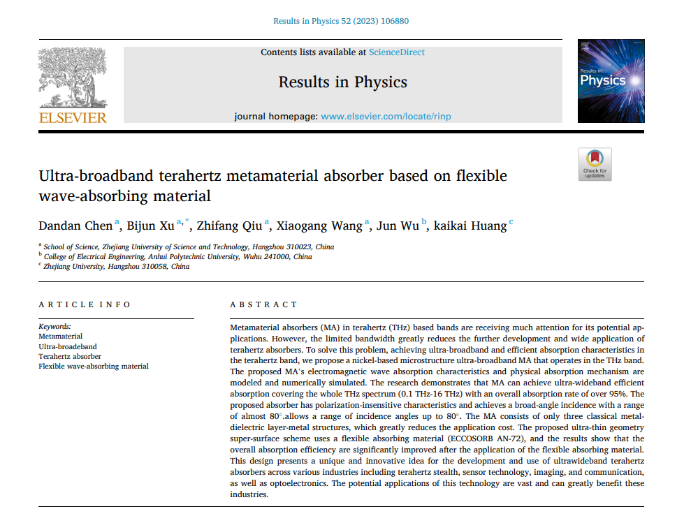 光子与光场调控研究团队中2021级研究生陈丹丹以第一作者身份在《Results in physics》 期刊上发表了题为“Ultra-broadband terahertz metamaterial absorber based on flexible wave-absorbing material”的创新研究文章。浙江科技学院为第一完成单位,应用物理系徐弼军和汪小刚分别为论文通讯作者和共同指导教师。《Results in physics》是ELSEVIER旗下著名期刊,影响因子4.565,中科院分区SCI二区期刊。