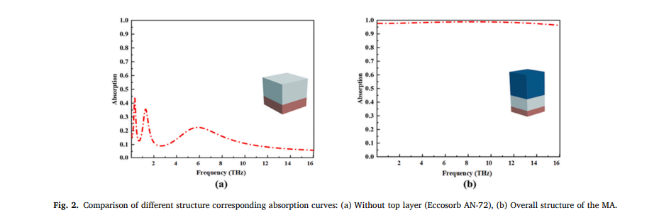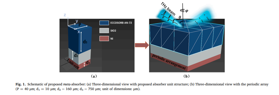该论文利用多重反射及阻抗匹配理论,基于柔性吸波材料(ECCOSORB AN-72)设计了可实现覆盖整个太赫兹波段(0.1-16THz),实现THz全光谱范围内的吸收率均超95 %,满足广角入射、偏振不敏感等基本属性的超宽带电磁波吸收器。该设计结构简单,无顶层复杂图案化设计,应用成本低,为基于太赫兹波段的超宽带电磁波吸收器的设计提供了一定的参考价值。太赫兹技术的应用将在无损检测、安检、医学成像和无线通信等领域发挥重要作用。