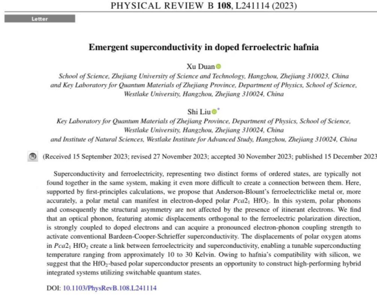 量子关联物质研究团队的段旭博士在国际著名物理学术期刊Physical Review B上在线发表了题为“Emergent superconductivity in doped ferroelectric hafnia”的论文[Phys. Rev. B 108, L241114(2023)]。 浙江科技大学为第一单位,青年教师段旭为第一作者,西湖大学刘仕教授为通讯作者。该研究得到了国家自然科学基金的支持。