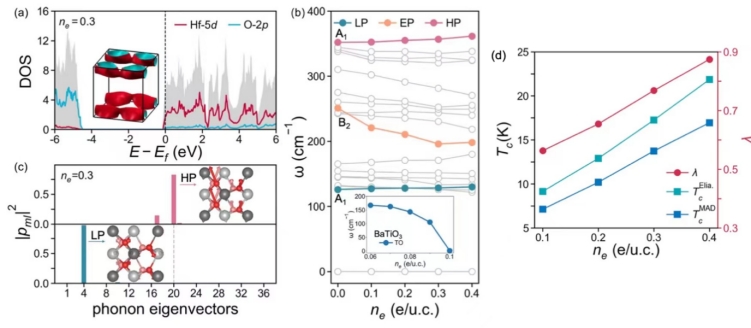 图.电子掺杂HfO2的电子结构、声子、电声耦合强度以及超导转变温度的计算结果。