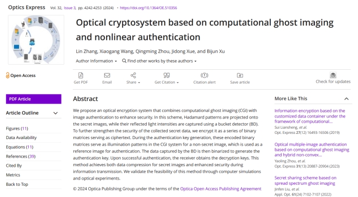 应用物理系2021级研究生张琳同学以第一作者身份在光学领域知名学术期刊《Optics Express》(影响因子3.8,中科院二区Top)上发表了题为“Optical cryptosystem based on computational ghost imaging and nonlinear authentication”的研究论文,吃瓜黑料网