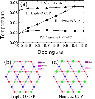 针对钒基笼目超导体中随着温度的降低相继出现的一系列非同寻常的电子物相,研究团队提出了一个基于电子间基本相互作用的微观理论模型,将电荷密度波和超导序参量放在同等的地位进行全自洽的理论计算,系统研究了钒基笼目超导体中手性电荷密度波以及由其驱动的电子向列态与超导配对之间的相互影响。此模型很好的描述了随着温度降低相继出现的三重波矢的电荷密度波、电子向列态以及超导态的相变[图1(a)]。研究团队从掺杂和温度变化导致的费米面结构的变化和范霍夫点的移动解释了上述相变。同时,计算还发现电子向列态和超导交织的物相从能量上更有利于超导的出现。另外,在电子向列态和超导交织的情况下,传统的在位s波超导也将显示出有节点的特征[图2(e)、2(f)]。这些理论结果不仅从微观角度揭示了新型笼目超导体中丰富电子物相的成因,而且还有助于深入理解笼目超导体特殊的晶格和能带结构以及其他有序相对超导特性的影响。相关研究成果以“Interplay between chiral charge density wave and superconductivity in kagome superconductors studied by self-consistent mean-field theory”为题发表在国际著名学术期刊Physical Review B上 [Phys. Rev. B 109, 104512 (2024)]。