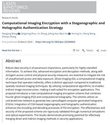 对于高度机密的信息而言,强大的数据安全性至关重要。先进的加密与解密方法、严格的访问控制以及物理安全措施,可极大地降低未经授权访问和数据泄露的风险。传统的加密方法更侧重于数据传输过程中的保护,而对数据完整性本身的关注相对较少。在这项工作中,研究团队提出了一种计算成像加密方法,将隐写术和全息认证策略集成到了傅里叶鬼成像的加密和解密过程中。该方法通过未训练树状神经网络模型生成两个具有隐写和认证功能的计算机生成全息片。当使用指定的衍射距离和波长对级联的全息片进行照射时,可得到用于非线性相关认证的模糊图像。当两个全息片分别以不同的距离发生衍射时,则可产生两个清晰的非秘密图像。在鬼成像系统中,这两个重构图像用于生成光信息加密的采样路径。这项工作将傅里叶鬼成像、深度学习和计算全息术相融合,增强了数据访问控制和物理安全措施,展示了先进计算成像技术在推进信息安全方面的重要潜力。(应用物理系 孙婷婷 学科办 陈璟)