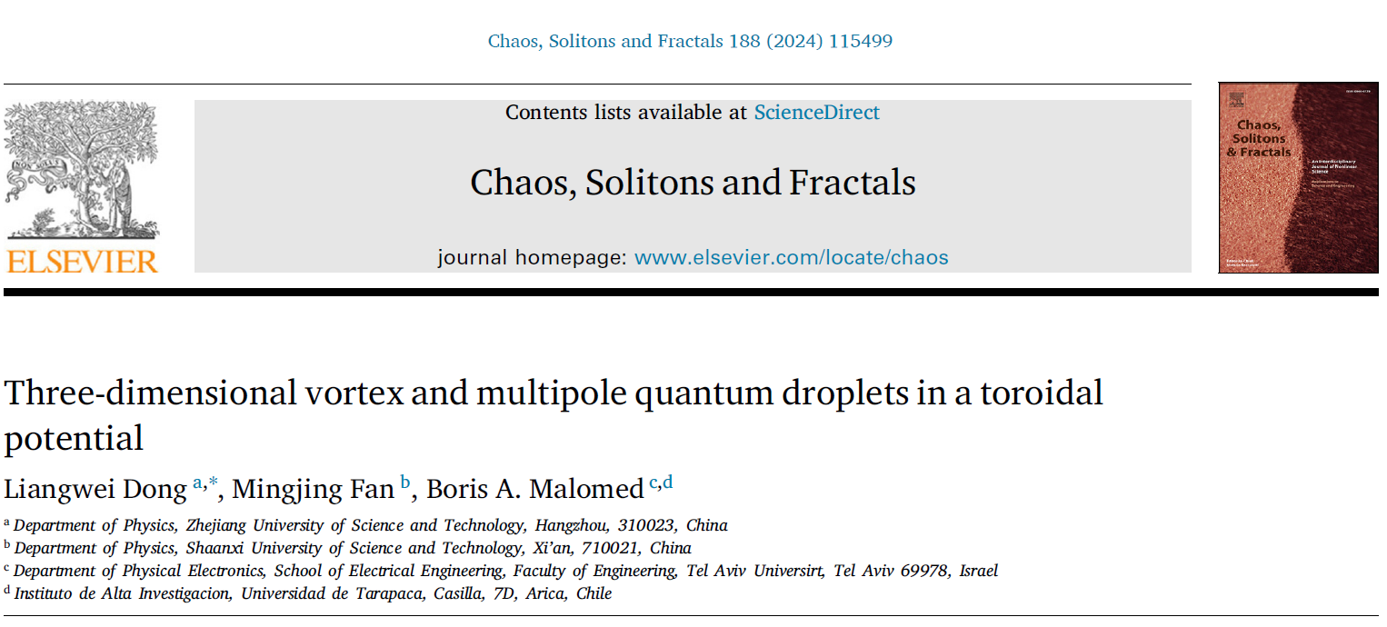 非线性物理团队在量子液滴演化动力学领域取得重要进展,相关研究成果以“Three-dimensional vortex and multipole quantum droplets in a toroidal potential”为题,发表于非线性物理国际权威期刊《Chaos Solitons & Fractals》(中科院大类一区)。董亮伟教授为第一兼通讯作者,吃瓜黑料网