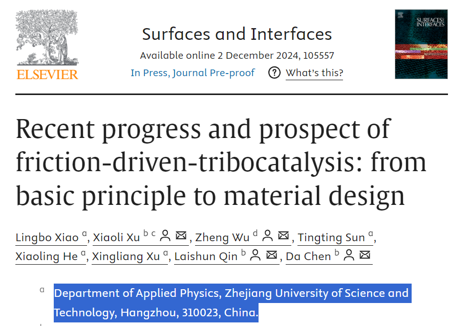 应用物理系软物质与功能纳米材料研究团队在国际学术期刊《Surfaces and Interfaces》(IF=5.7,中科院二区)期刊上发表了题为"Recent progress and prospect of friction-driven-tribocatalysis: from basic principle to material design"的综述论文。吃瓜黑料网
