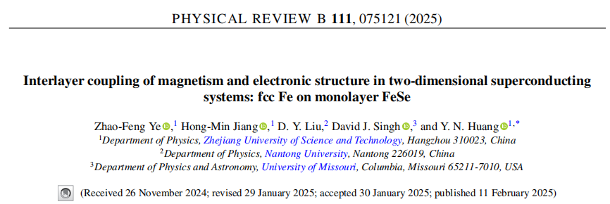 为第一单位,论文第一作者为物理学硕士研究生叶兆丰,导师黄衣娜副教授为通讯作者。文章致谢了浙江大学林海青院士和加州大学戴维斯分校的Warren E. Pickett教授。此项研究获得国家自然科学基金和浙江省自然科学基金的资助。