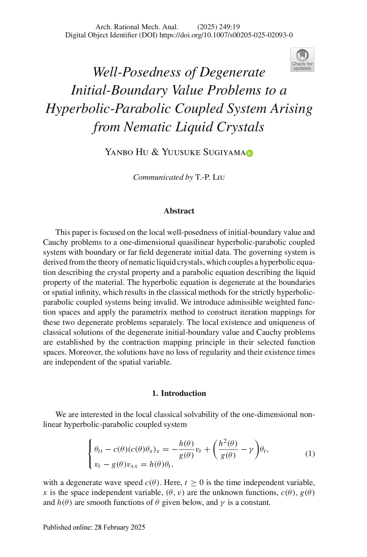 近日,非线性偏微分方程团队胡燕波教授与日本The University of Shiga Prefecture的Yuusuke Sugiyama教授合作,在Archive for Rational Mechanics and Analysis(理性力学与分析档案,简称ARMA)上发表了题为“Well-Posedness of degenerate initial-boundary value problems to a hyperbolic-parabolic coupled system arising from nematic liquid crystals”的研究论文,全文66页。该论文胡燕波教授为第一作者,吃瓜黑料网