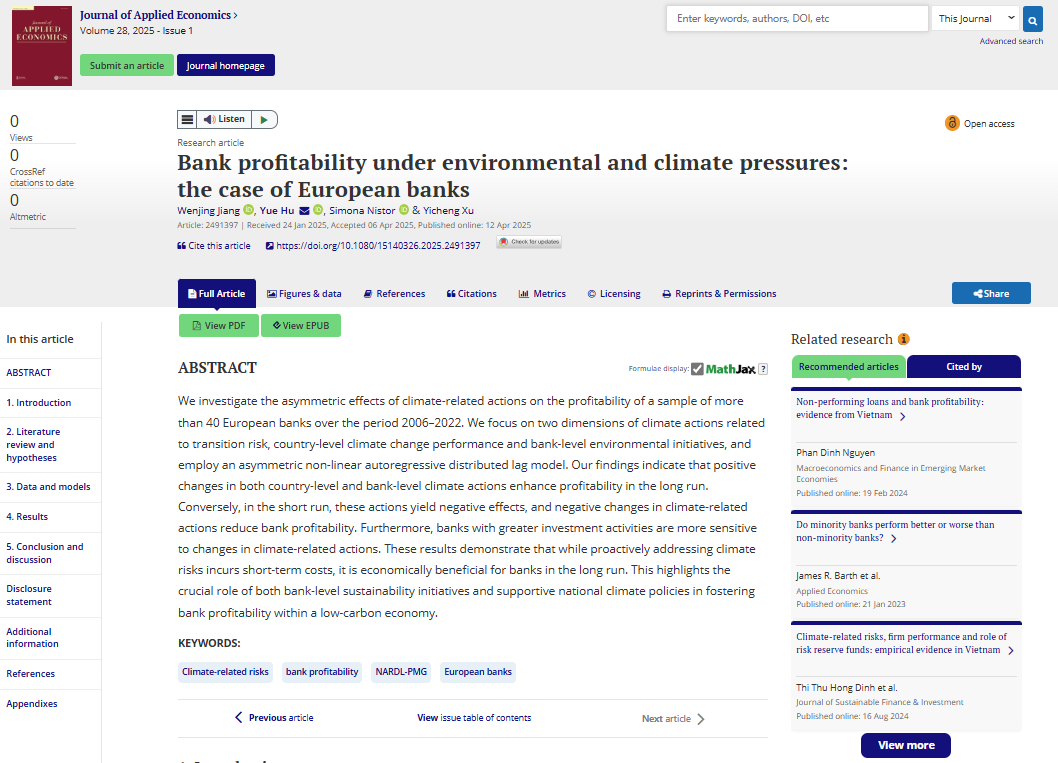 胡月教授共同研究成果《环境与气候压力下的银行盈利能力:以欧洲银行为例》在国际期刊《Journal of Applied Economics》上发表。