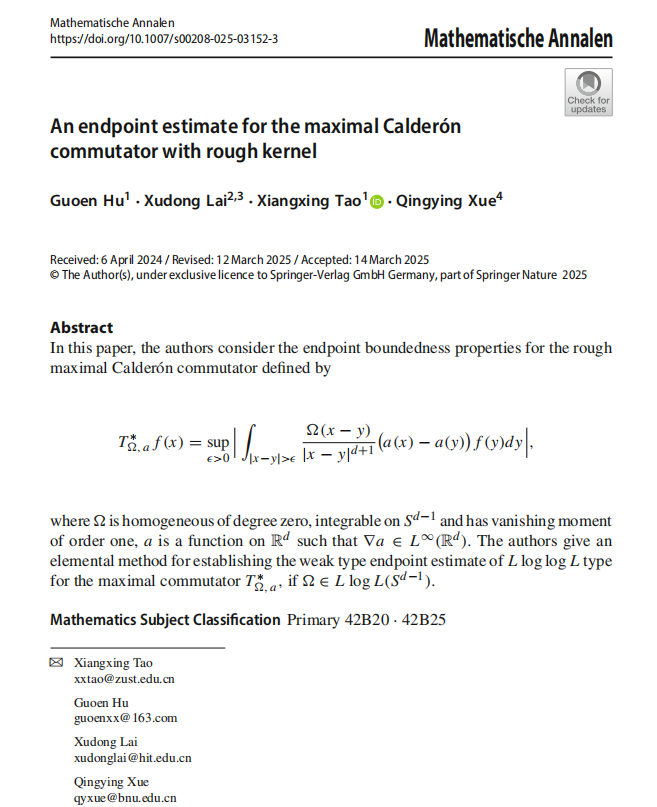 近日,实分析与调和分析及应用团队胡国恩教授、陶祥兴教授与合作者在数学领域著名的德国数学年刊《Mathematische Annalen》上发表了题为“An endpoint estimate for the maximal Calderón commutator with rough kernel”的研究论文,全文35页。此论文胡国恩教授为第一作者,陶祥兴教授为通讯作者,吃瓜黑料网
