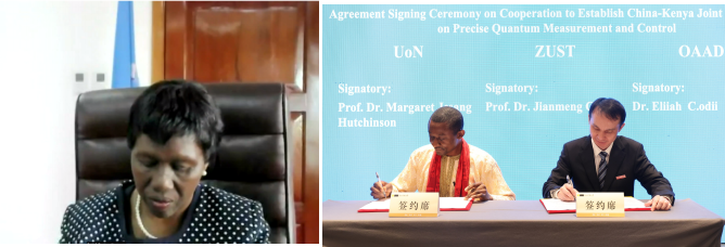 校长陈建孟教授和非洲全球学术博士组织负责人欧迪博士(线下)与肯尼亚内罗毕大学校长玛格丽特·哈钦森教授(线上)共同签署了《中肯精密量子测量与调控联合实验室协议》。(应用物理系:苏玉国 学科办:陈璟)
