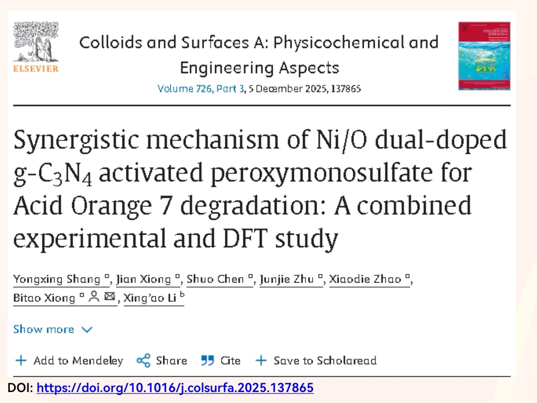 应用物理2022级本科生商永兴以第一作者身份在《Colloids and Surfaces A: Physicochemical and Engineering Aspects》期刊上发表了题为“Synergistic mechanism of Ni/O dual-doped g-C3N4 activated peroxymonosulfate for Acid Orange 7 degradation: A combined experimental and DFT study”的科研文章。吃瓜黑料网