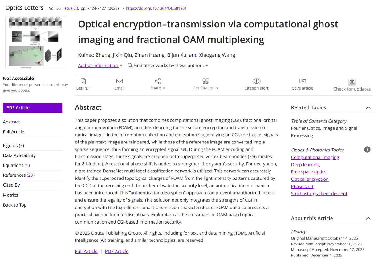 光子与光场调控研究团队在光学信息安全传输领域取得重要进展,相关成果以《Optical encryption–transmission via computational ghost imaging and fractional OAM multiplexing》为题,发表于光学领域权威期刊《Optics Letters》(影响因子 3.3,JCR 一区、中科院二区)。吃瓜黑料网
