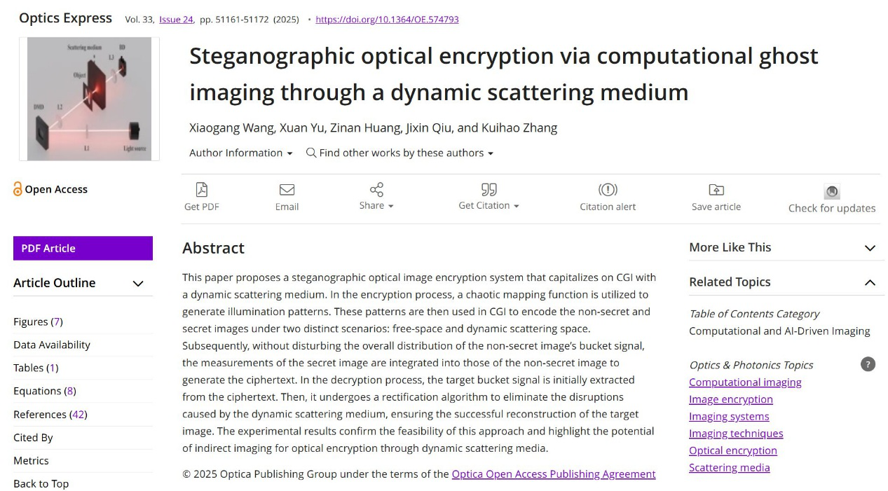同期,光子与光场调控研究团队在光学领域知名学术期刊《Optics Express》(影响因子3.3,JCR一区、中科院二区)发表了题为“Steganographic optical encryption via computational ghost imaging through a dynamic scattering medium”的研究论文。该成果提出了一种利用动态散射介质结合计算鬼成像的隐写式光学加密系统。加密过程中,分别在自由空间和动态散射空间两种场景下对非秘密图像和秘密图像进行编码。接着,在不干扰非秘密图像桶信号整体分布的前提下,将秘密图像的测量数据融入非秘密图像的测量数据中,从而生成密文。解密阶段,先从密文中提取目标桶信号,再通过校正算法消除动态散射介质造成的干扰,确保目标图像成功重建。实验结果验证了该方法的可行性。该工作凸显了基于动态散射介质的间接成像技术在光学安全领域的应用潜力。吃瓜黑料网