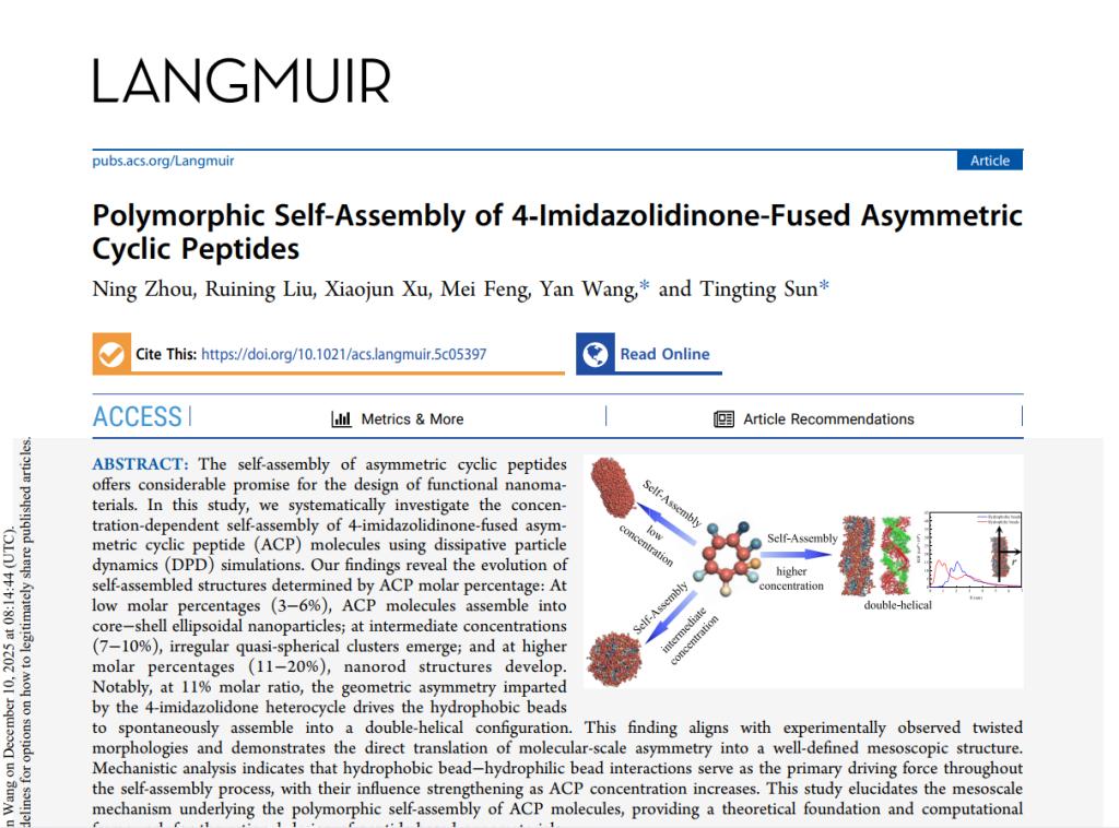 为第一单位在国际期刊LANGMUIR(IF = 3.9,中科院SCI二区,JCR Q1)上,在线发表题目为“Polymorphic Self-Assembly of 4-Imidazolidinone-Fused Asymmetric Cyclic Peptides”的论文。物理学硕士研究生周宁为该论文第一作者,应用物理系王艳博士和孙婷婷教授为通讯作者。该研究得到了国家自然科学基金的支持。